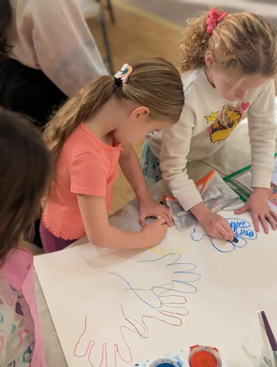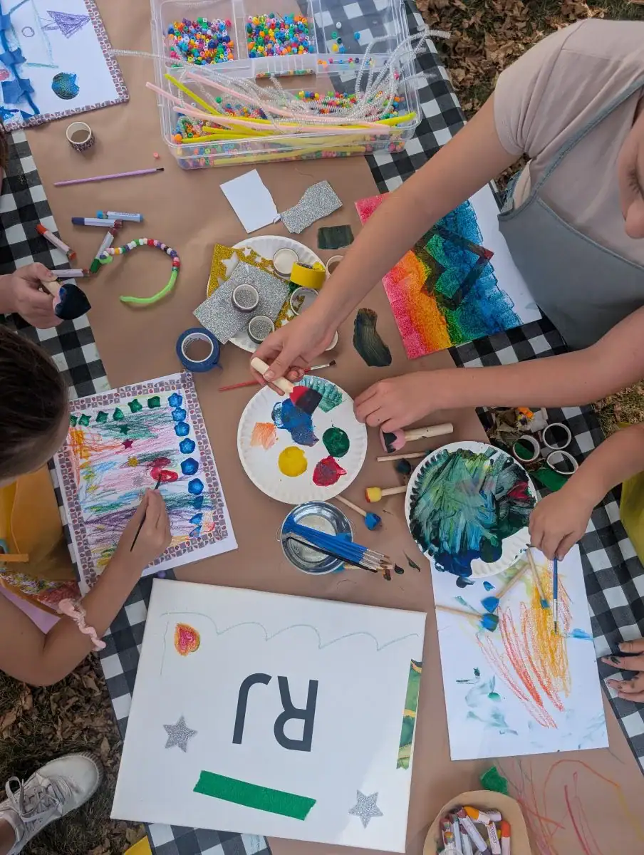 We arrive with our mobile art and play studio and set up a series of guided stations designed for open participation. Kids can join for a few minutes or stay for the full experience.