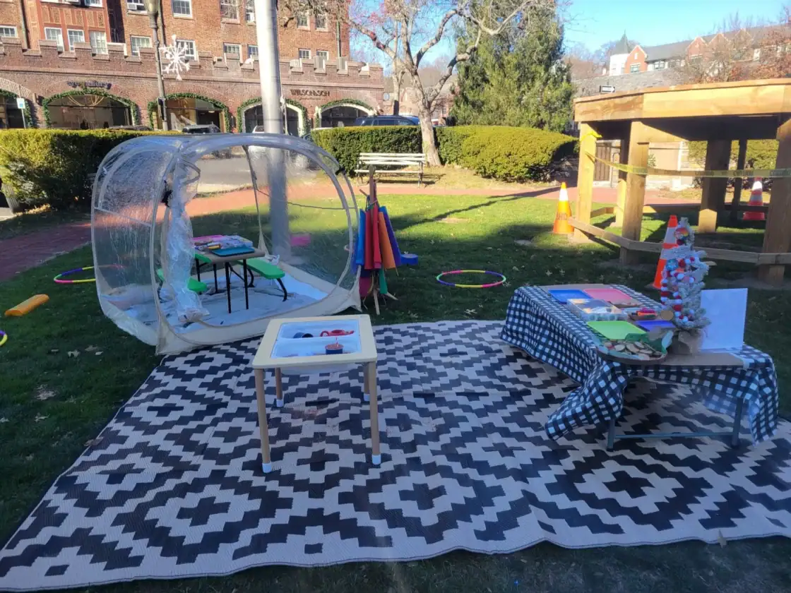 We arrive early with our mobile art and play studio and set up a dedicated area with multiple stations for open participation. We can bring our tables or use yours, depending on the event space. For indoor events, we bring floor coverings to protect from any unwanted messes. Not sure about how much space we need?